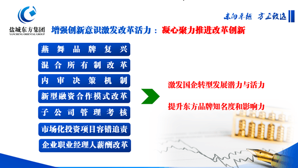 “乘著自上而下的解放思想促發(fā)展行動,我們將矢志不渝地推進系列改革創(chuàng)新,主要包括市場化投資項目容錯追責、燕舞品牌復興、混合所有制改革、企業(yè)經(jīng)理人薪酬制度改革、新型融資合作模式創(chuàng)新等方面,目前重點推進上海三處資產(chǎn)證券化,力爭年內(nèi)全部獲批、成為全省第一單;推進京東金融等20多億元股權再融資,加快區(qū)內(nèi)100多萬平方米標準廠房資產(chǎn)證券化進程;加快推進15家子公司市場化,將更多的員工引向市場化、效益化的最前沿,為國企改革探路、為轉(zhuǎn)型創(chuàng)新。”張振國和盤托出該集團改革創(chuàng)新的下步思路,以增強創(chuàng)新意識,在激發(fā)活力、創(chuàng)塑品牌上再立新標桿的舉措和決心。