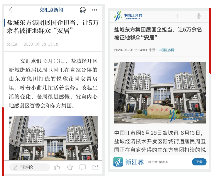6月28日,《新華日報》第4版“一線視點”刊發(fā)《鹽城東方集團展國企擔當,讓5萬余被征地群眾“安居”》,《交匯點》新聞客戶端、《中國江蘇網》同期轉發(fā),關注報道鹽城東方集團始終堅守為民初心,在區(qū)域發(fā)展中展現(xiàn)國企擔當,聚力建設宜居宜業(yè)“幸福經開區(qū)”的舉措和成效。